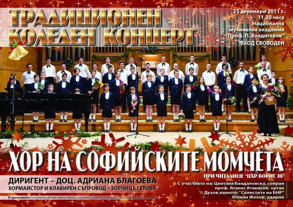 Тази година Традиционният коледен концерт на Хора на софийските момчета при Читалище „Цар Борис III “ ще се проведе на 25 декември 2011 г., от 11.30 часа, в Голямата зала на Национална музикална академия „Проф. Панчо Владигеров“,