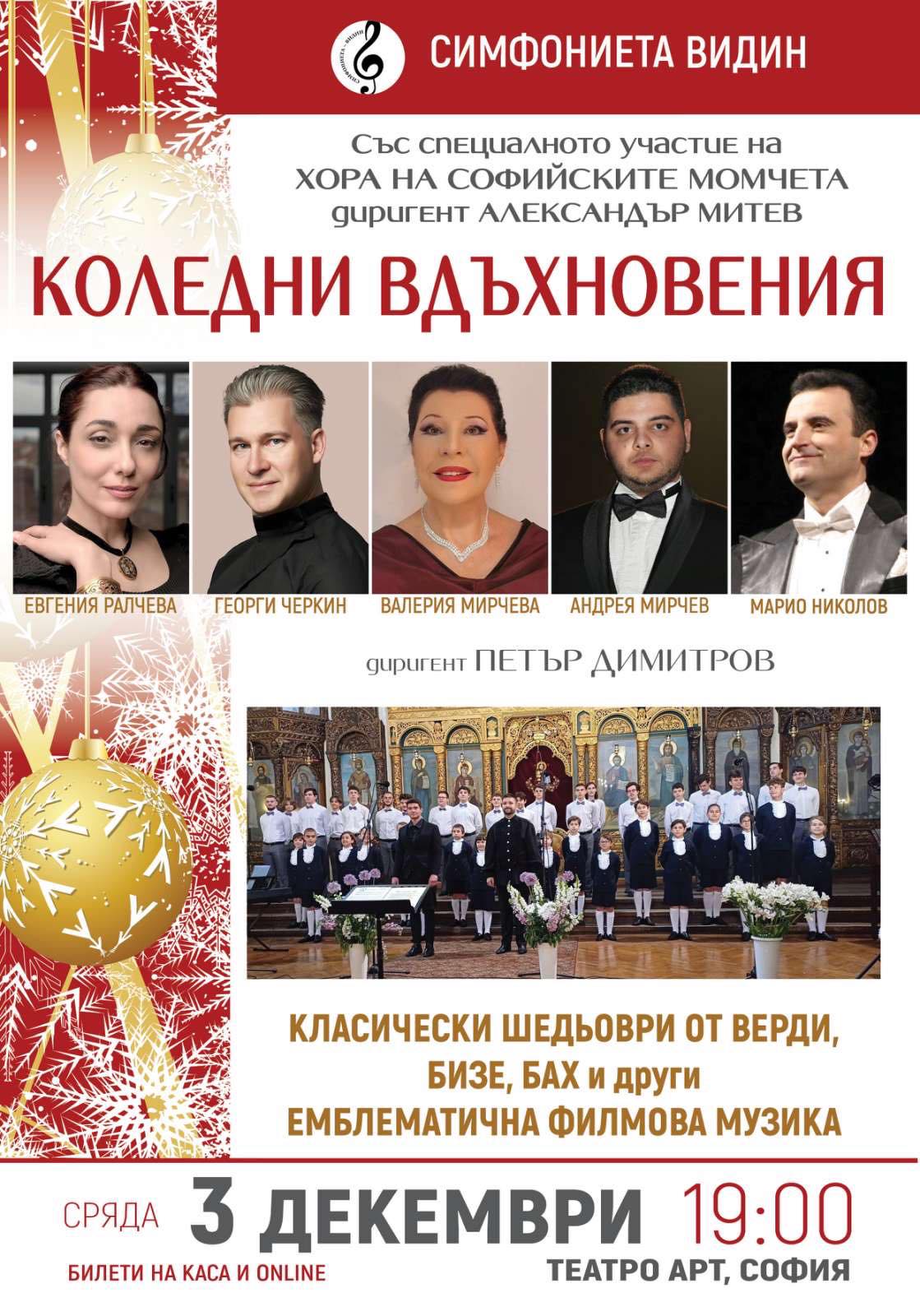 На 3 декември в столичното Театро „АРТ“ ще се състои празничният концерт „Коледни вдъхновения“, организиран от Art Music Centre. Събитието събира на една сцена изтъкнати български музиканти – Георги Черкин, тенорите Марио Николов и Андрея Мирчев, примите на Пловдивската опера Валерия Мирчева и Евгения Ралчева, както и Симфоничният оркестър на Видин под диригентството на Петър Димитров. Специално участие ще вземе Хорът на Софийските момчета с диригент Александър Митев.